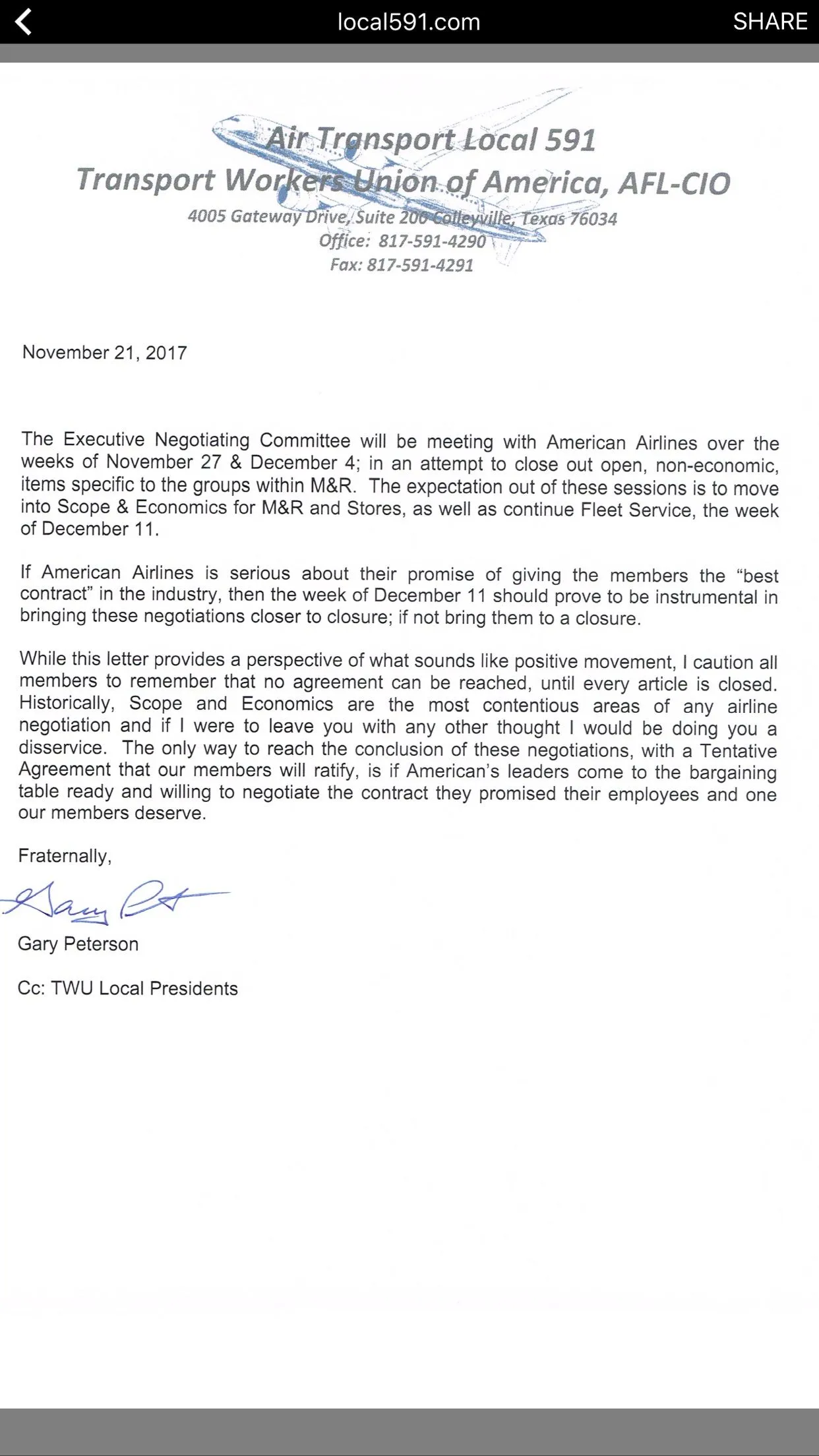 started as a member of Track Gang and work his way up to where he is today. TWU Local 100 controlled convention items and the Air Transport Division had little or no say in that political arena. I remember a letter this year, that said something about Samuelson being promoted at the International. If he is one of the big guns at the negotiating table, does he really have a lot of concern for the members who are mechanics or is he a just another TWU member/officer that came from New York? Only time well tell. If he has the power from his throne to force Doug Parker to hold the company to the promise of Delta +7% or even 3%. Whoever is at the negotiation table has the ability to control the local presidents and to what purpose. The torch the TWU carries is for all members to better themselves, but the LAA mechanic has been traditionally some of the lowest compensated across the indusrty. One reason use to be that our pension was one of the best in the industry, but with it being frozen that part of compensation has fallen away. Samuelson controlling the Locals from the international and those from the locals with the larger numbers controlling the vote by majority. For many years a contract was not ratified unless all Title groups were finished and the fact was that Fleet had the numbers. Of course the Line Station mechanics until recently have been angry at TULE because the interests of the mechanic were diluted by the TULE coalition.
