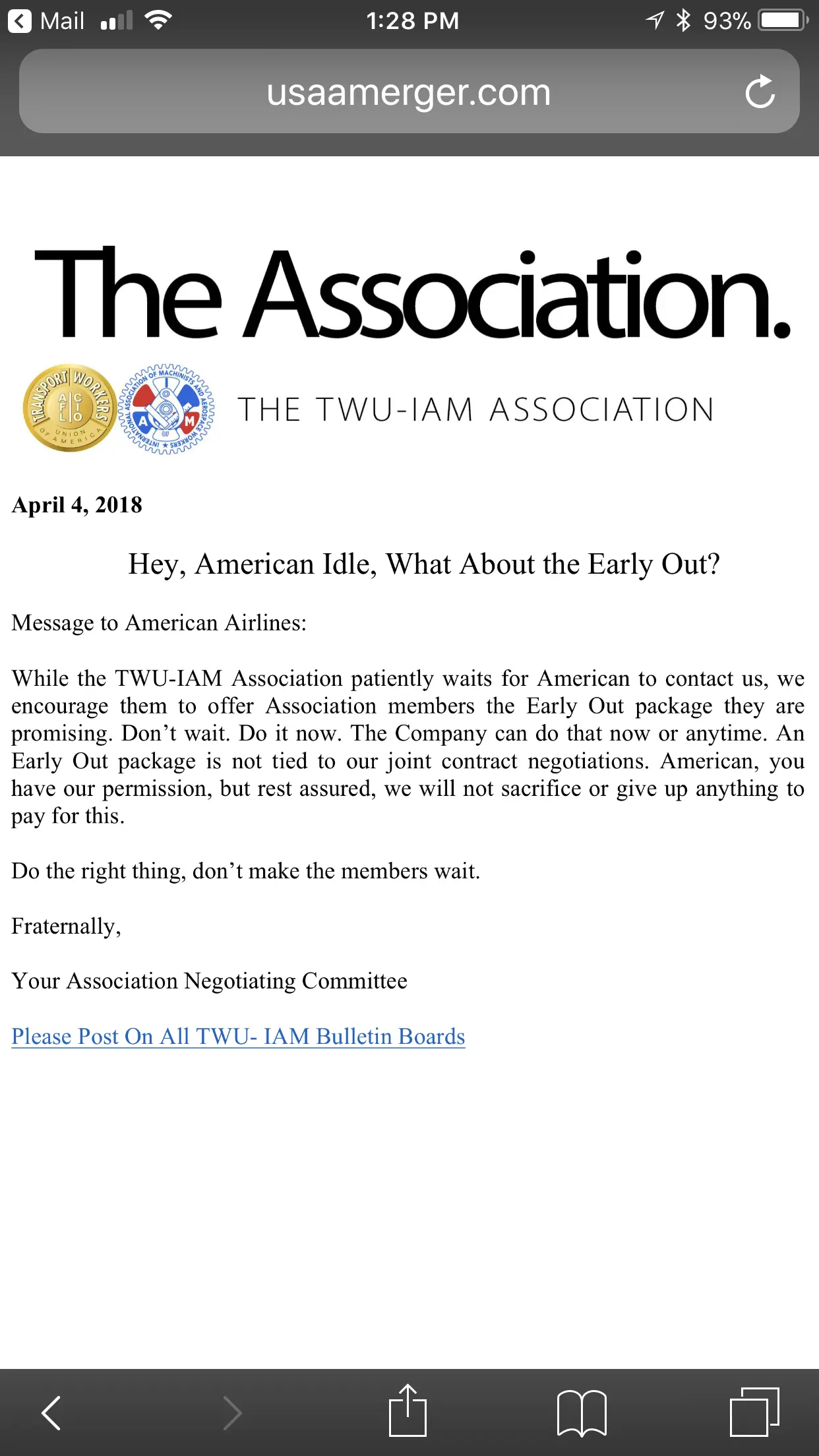 I want my contract group to be in ONE UNION this Association is a Train Wreck, that was made obvious from the Demonstrations. We Must get out of it, I made that perfectly clear when I was in office and have not changed my position, if they wanted to divy up the members they should have done it by classification, they could have put all M&R in the IAM and all Fleet in TWU or the other way around, but as a Union man you are being deceptive and omitting facts to serve whatever your agenda is by defending this Association, the Agents voted to merge, the West had no union until they heard about the merger and still never had a contract. The Core principle of Unionism is that the members democratically choose their representation, yet you defend undemocratic actions. I don't believe that the TWU can't get us out and if they wont get us out then we must get rid of the TWU. We gave them 4 years to make this work. It has failed. I have stayed silent for a long time but enough is enough. Samuelson needs to **** or get off the pot, he would not allow this sort of a structure in Local 100. The least he could do is clean up the TWU M&R side give AA workers the same Structure as SWA TWU members. Locals by Class and craft. It works for them, it would work for us.