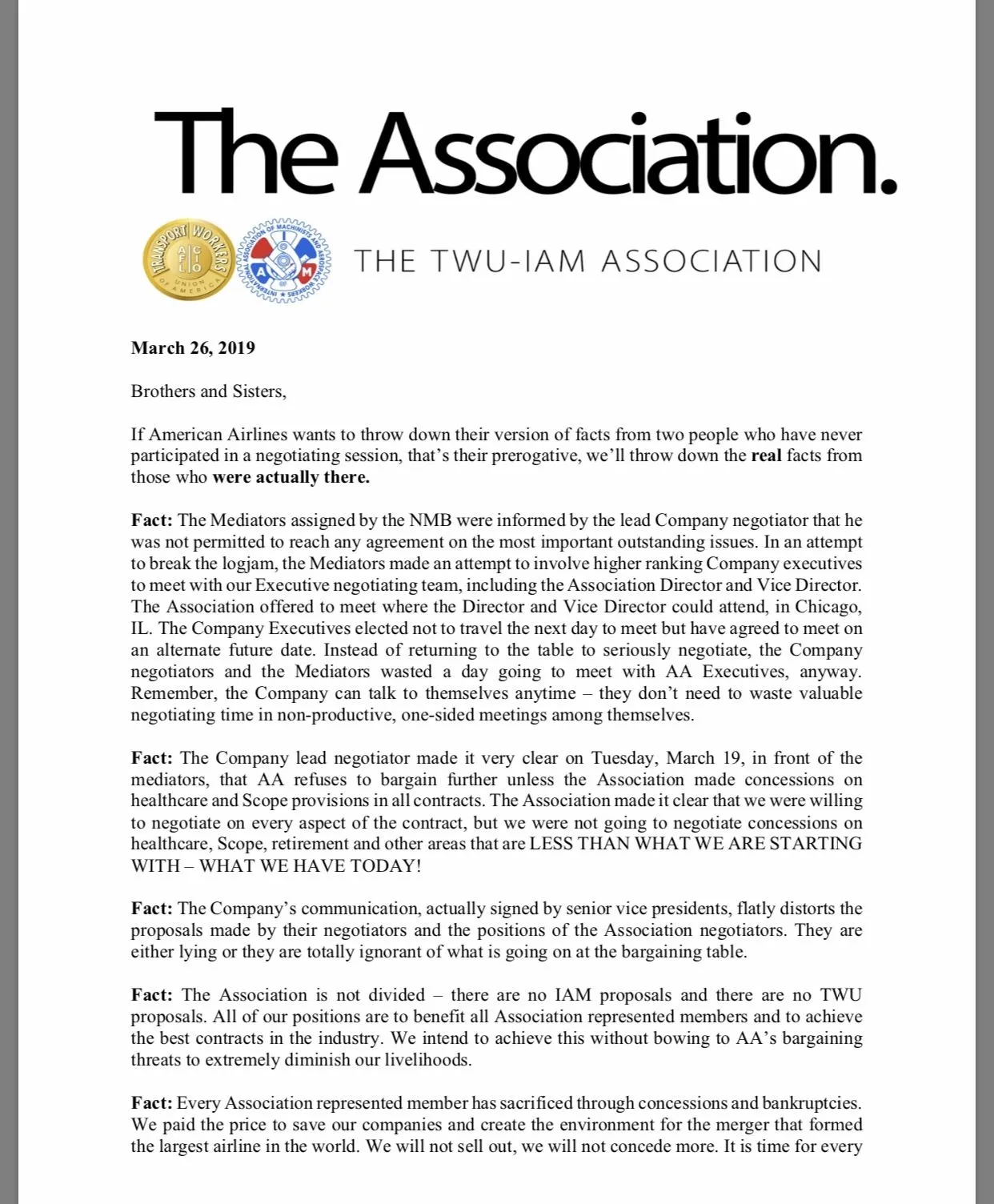 Fact: Every Association represented member has sacrificed through concessions and bankruptcies. We paid the price to save our companies and create the environment for the merger that formed the largest airline in the world. We will not sell out, we will not concede more. It is time for every Association represented member to make American Airlines understand that they must get serious at the table to finish these negotiations. The Company must hear from you that their miscommunication garbage will not work.