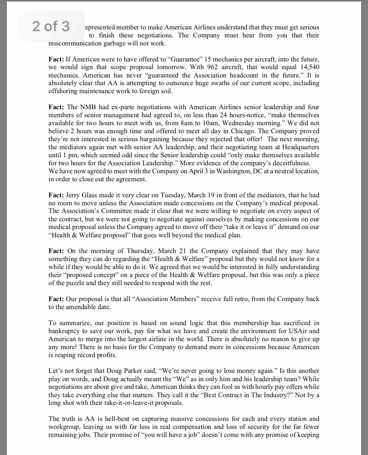 Fact: The Company lead negotiator made it very clear on Tuesday, March 19, in front of the mediators, that AA refuses to bargain further unless the Association made concessions on healthcare and Scope provisions in all contracts. The Association made it clear that we were willing to negotiate on every aspect of the contract, but we were not going to negotiate concessions on healthcare, Scope, retirement and other areas that are LESS THAN WHAT WE ARE STARTING WITH – WHAT WE HAVE TODAY!