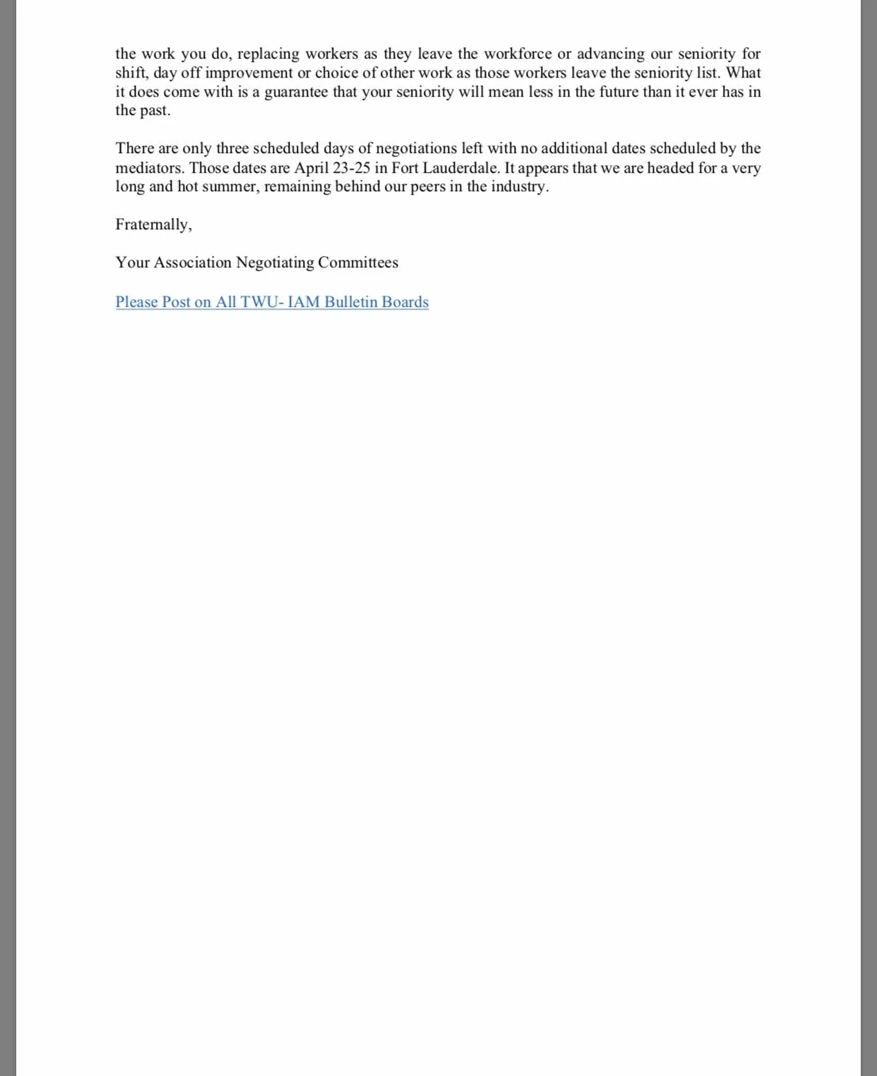 There are only three scheduled days of negotiations left with no additional dates scheduled by the mediators. Those dates are April 23-25 in Fort Lauderdale. It appears that we are headed for a very long and hot summer, remaining behind our peers in the industry.