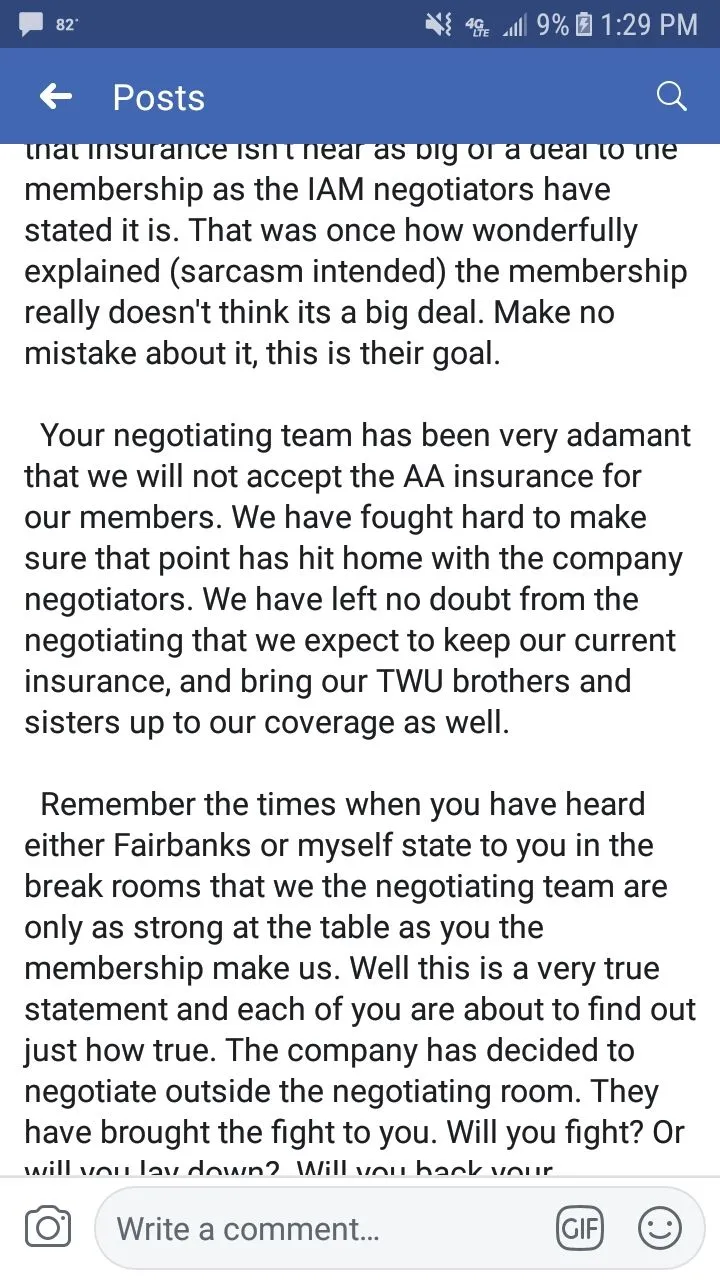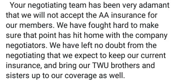No the medical is not the only topic, and my apologies if I came off that way but imo it is item #1 on the IAM side and they have a 50% say on if a contract comes back to the membership for a vote. So while Mntc outsourcing and pt % are larger issues on the TWU side, I think the hold up will be the medical.