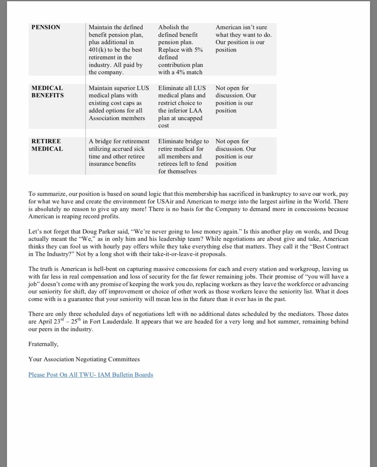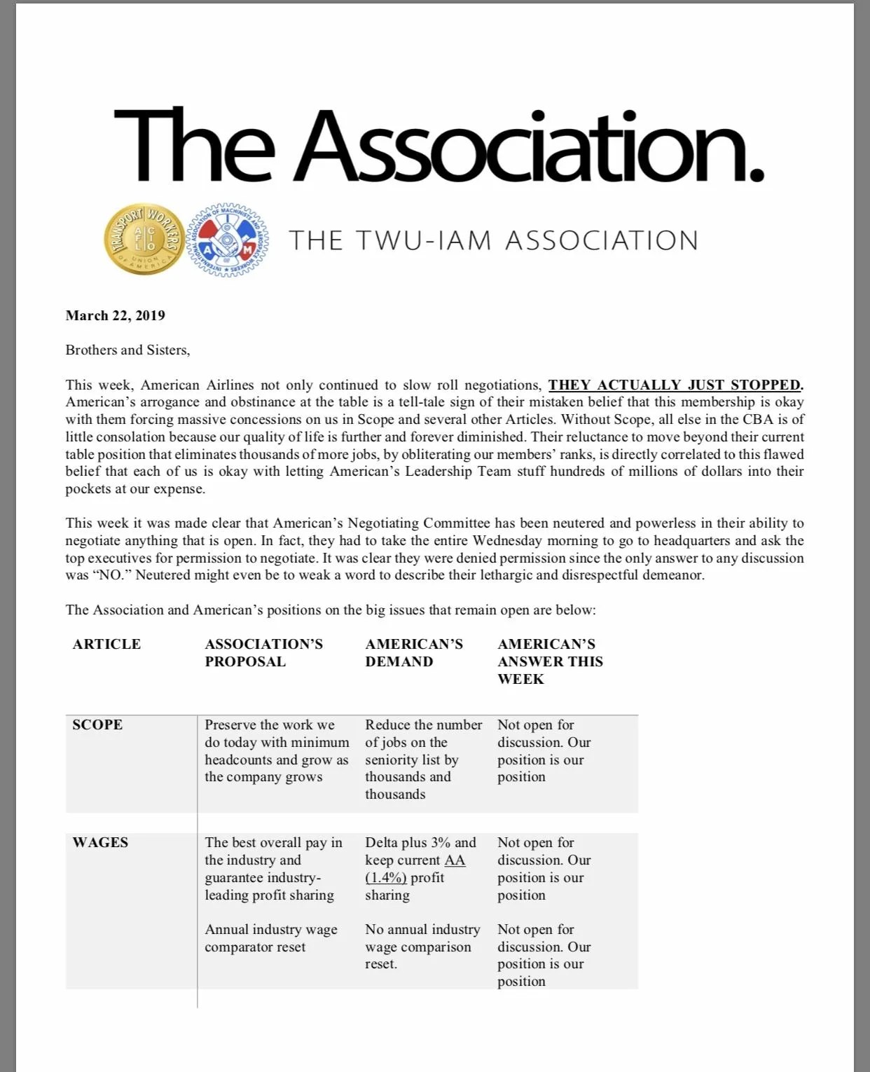 Just got an official update on negotiations which was more of a rant. No information at all. Most of it is just blatant lies telling us what the proposal is, in someone's opinion. What will happen is that they will eventually have to show us the company offer and it will expose them as liars. For fleet, it's a MONSTER cost positive contract for all with iron clad protections for 'current employees'. Not sure who is doing the hiring at HR but I doubt many of us want to forego thousands and thousands just so future undesirable employees can get hired and drop the dime, come in late, etc. But whatever the case, we need to vote now because the association isn't legitimate until there is a vote. It even admits this in its update. I told you guys that the company stopped negotiating. Tell Peterson thanks for his uncontrolled flip out episode.