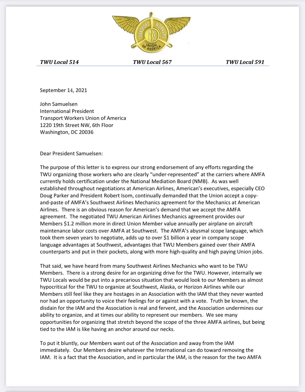 Let's talk about the main topic of this said letter here. The TWU wants the IAM out of their lives, period. They have FINALLY spoken openly to fire the IAM and this combined asso. forced down the throats of the entire membership at AA/US air.