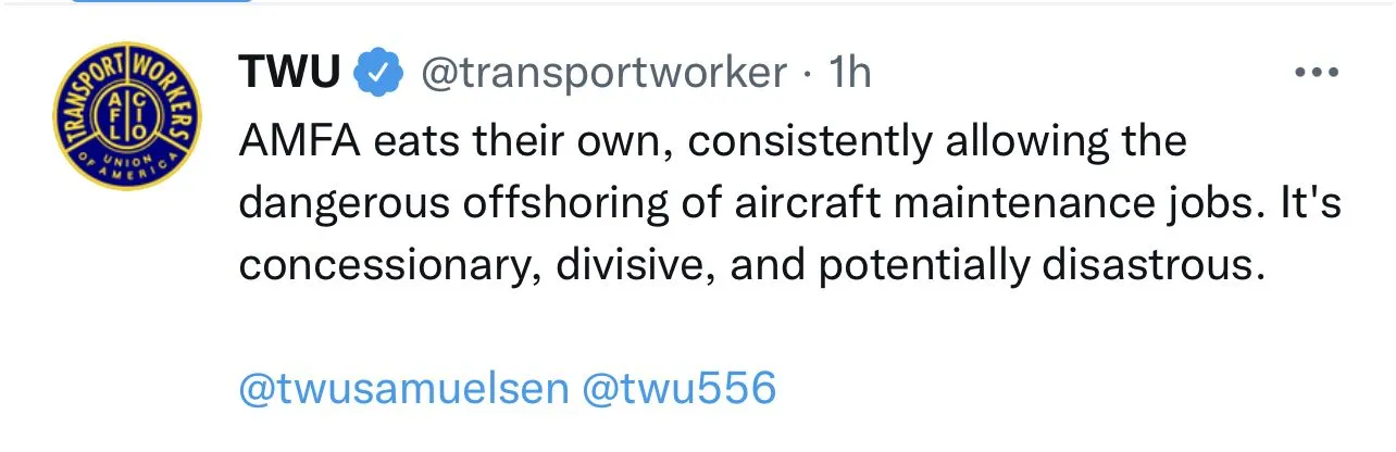 Reading what History? are you saying that AMFA members have been asking the TWU to start an Organizing Campaign at each of the carriers represented by AMFA? If that was the Case why haven't there been ANY Press release by the TWU or conversations anywhere about it?Sorry bro but from reading the History, AMFA has been asking for this for years. Samuelsen is right that they’re a bunch of sleazy operators. Oh and yes there are people at SWA and AK that want to dump them.