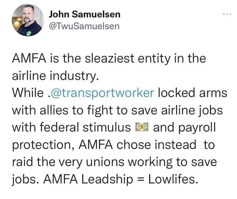 Are you saying that Samuelsen made these statements? If that is True then the TWU has found a way to RAID SWA & Alaska, because the membership of both carriers that are represented by AMFA even if they did come to the TWU would have been directed to the Organizing Division of the TWU. That MEANS that the TWU is Raiding since they are the ones with the PAID Organizing Division.