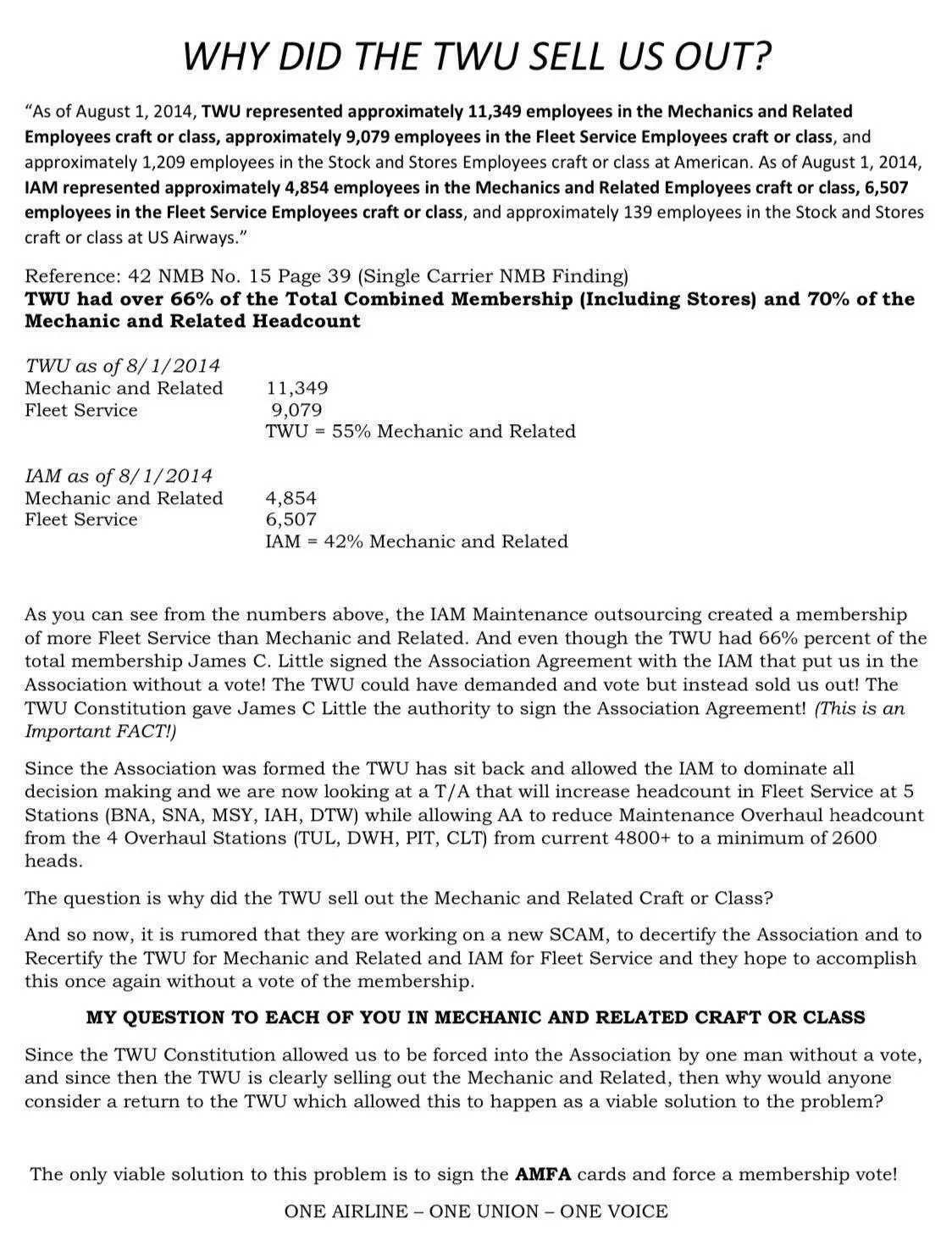 I'll be on the lookout.To SWAMT, 1AA and all the AMFA Supporters here and around the system, Aviation Junkie will be starting a NEW AMFA Organizing Committee to remove the TWU. So be sure to look for the announcement and his contact info, since he feels the current AMFA Committee is not smart enough to get it done. Let's all support his efforts with both groups we should have a filing with the NMB any time soon.