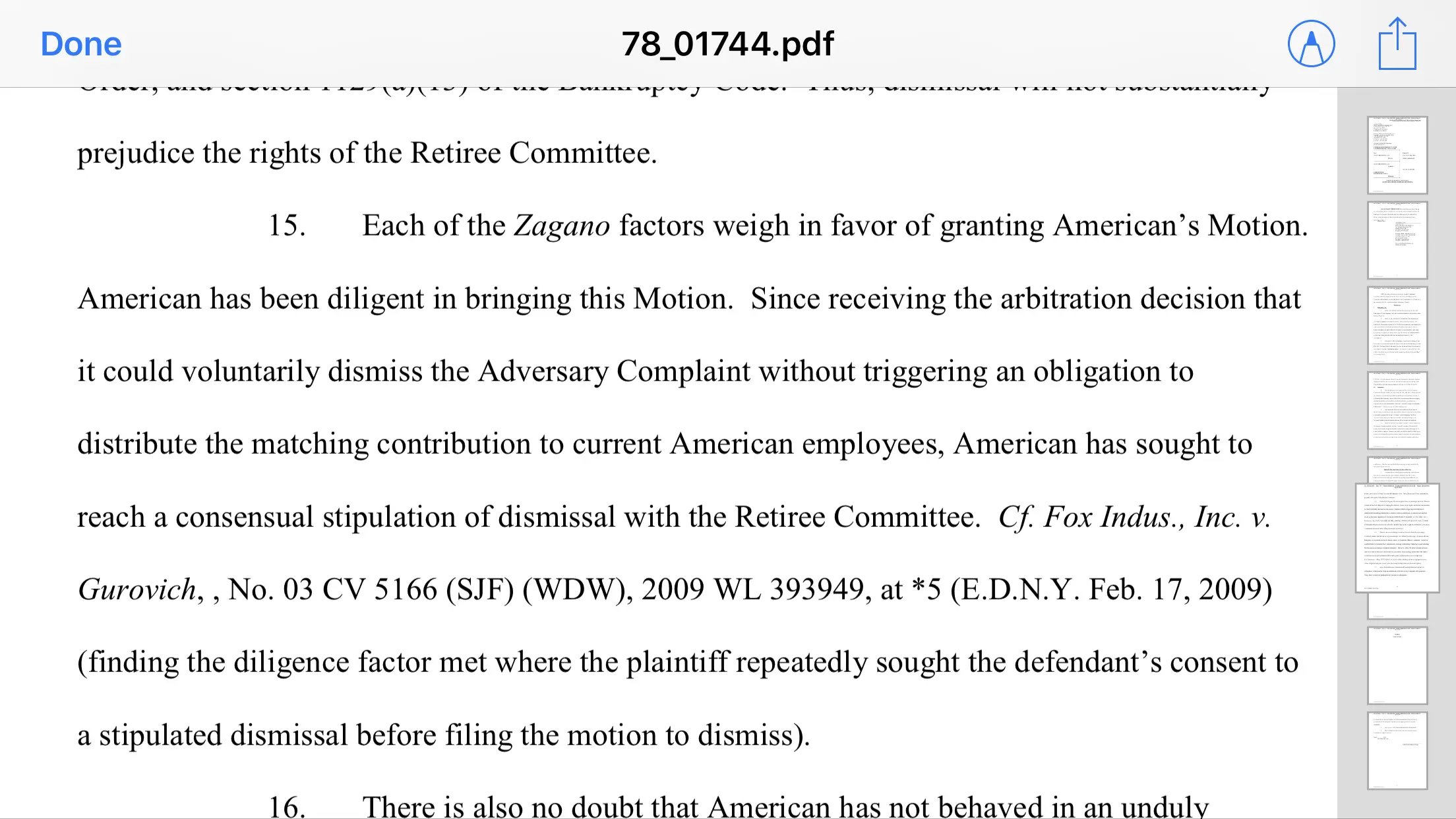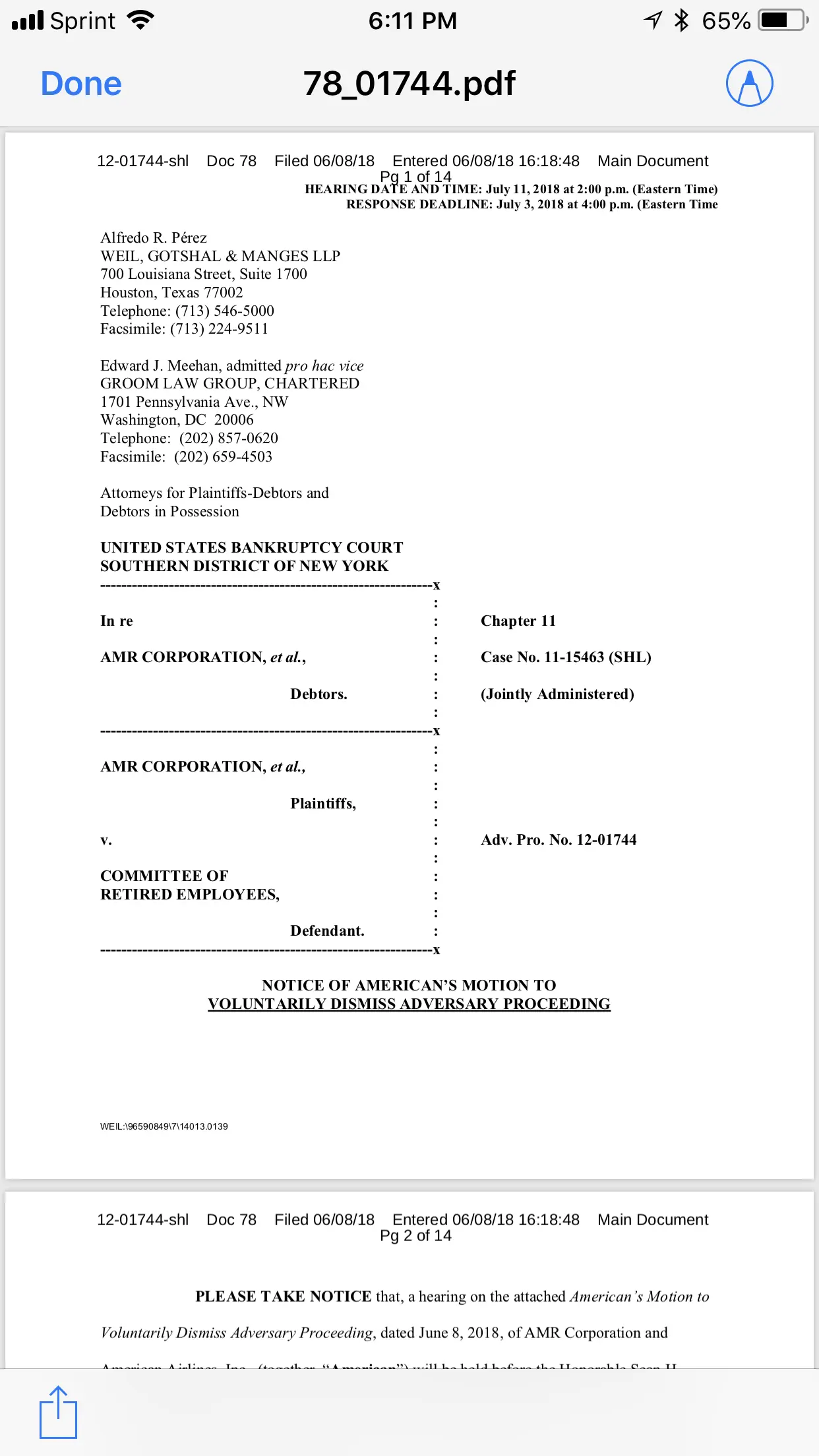 Second, the lawsuit that is pending against the Retiree Committee will continue. On July 6, 2012, American Airlines filed suit against its retirees, asking the Court to declare that it has the right to unilaterally take away the medical and life insurance benefits that retirees earned when they worked for American Airlines. On August 15, 2012, American Airlines filed a motion for partial summary judgment in that case, asking the Bankruptcy Court to rule that none of the American Airlines retirees has a “vested right” to the medical and life insurance benefits currently provided by American Airlines. American has argued that if the Court finds that retirees do not have a vested right to benefits then Section 1114 allegedly does not apply and American can supposedly terminate or modify the benefits without Court approval and without paying any damages to the retirees for the benefits they have lost. The Retiree Committee has opposed this motion. The Retiree Committee’s position is that the benefits are vested, that Section 1114 applies whether the benefits are vested or not, and that retirees will receive a claim whether the benefits are vested or not. If the Bankruptcy Court denied American’s motion, the case will be set for trial. If the motion is granted, in whole or in part, the Court will have to address the balance of the relief American requests, including whether and what to extent Section 1114 applies and whether retirees have a claim against the estate, still must be decided. American has, however, agreed in its Plan of Reorganization that if the final outcome of this lawsuit is that retirees are entitled to a claim against American for the value of any benefits that American eliminates, American will not eliminate the benefits and instead will continue to honor its contractual commitments to retirees to provide retiree benefits, meaning that retirees will continue to receive the benefits they were receiving when American filed for bankruptcy in November, 2011 and continue to receive today.