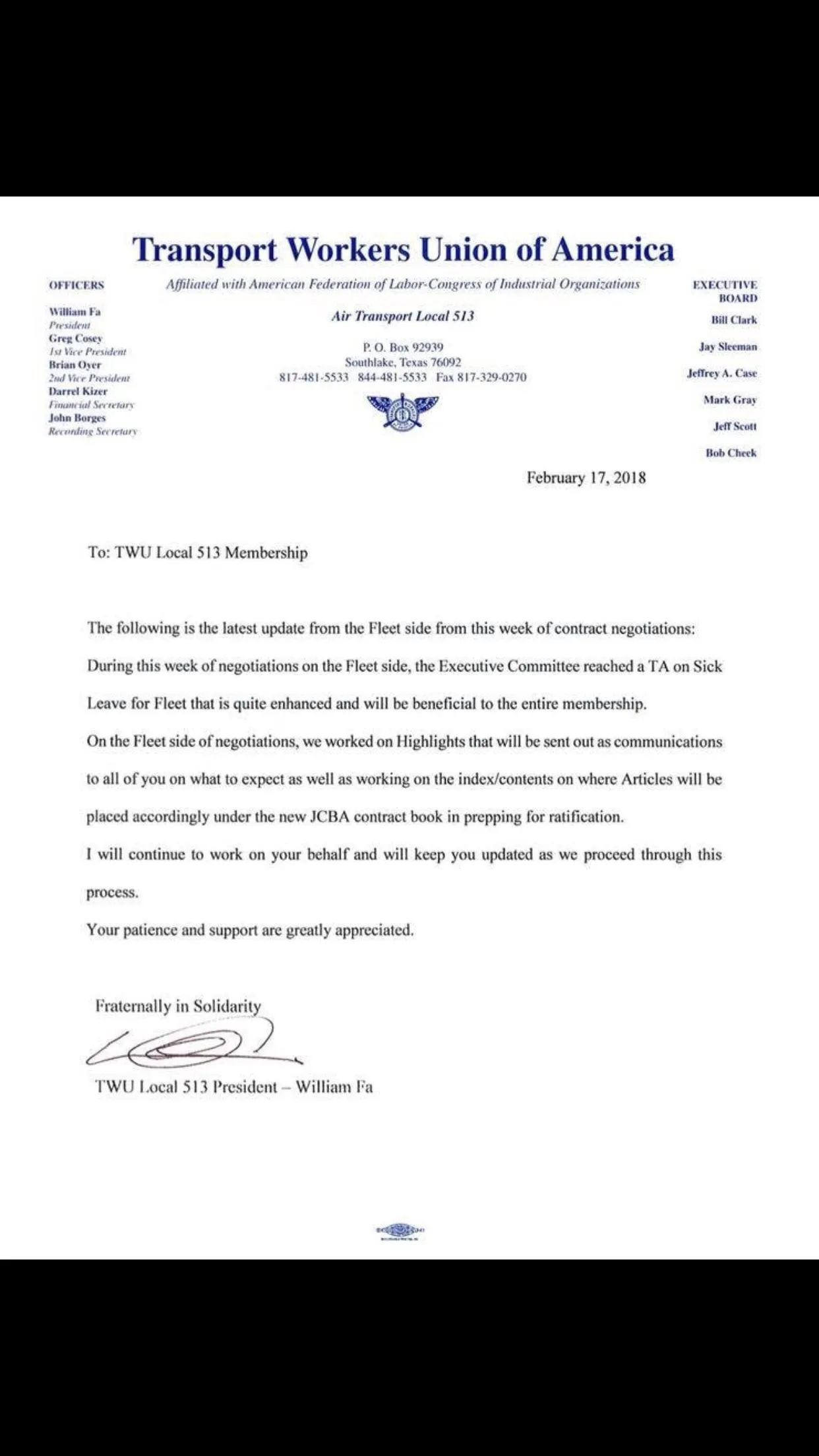 will it be the same for the mechanics as well? I would not think that the sick leave would be different from one group to another. If it is, it's the unions fault in my eyes.Fa is correct, we missed that in the update. We did get that TA in sick leave and worked at prepping the order of the articles, etc. I do think we are close, it all depends on whether the company is serious about getting it done soon. We are in D.C. again this week.