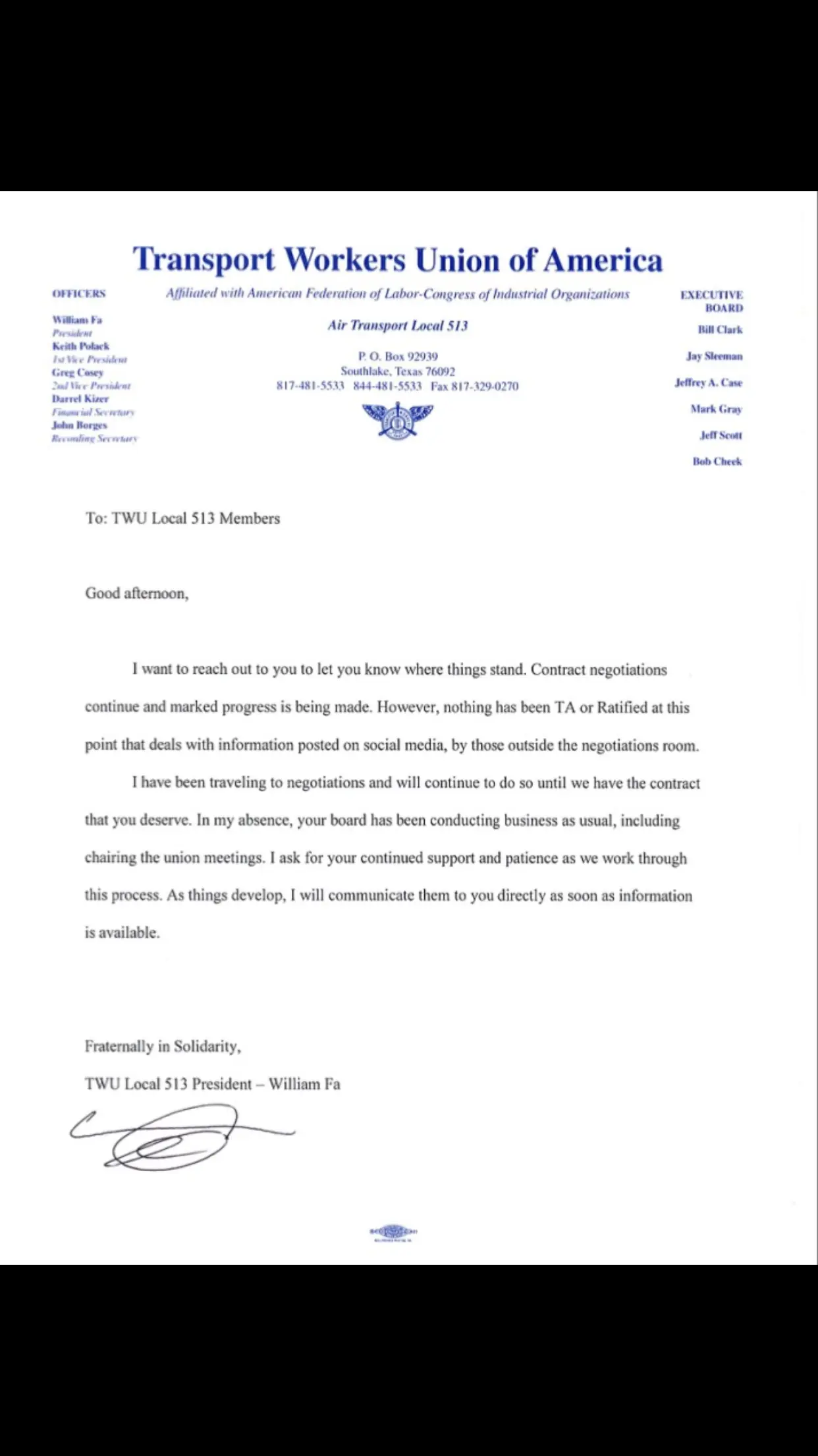 He wasnt refuting me but others who were spreading false information due to improper reading. Kindly review on FB what i put out. I specifically said that a ta may come as early as october but i personally think december is more likely. The company wanted ta by spring but then the iam got C blocked with a new election so they couldnt hose our lus health care as they were planning. Sito instead decided to wait till re enrollment to soften the political blow. So thats how it is.Oh no. Do we have another Tim Nelson Red Herring floating around out there? He actually was able to illicit a direct response from a TWU President.