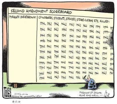 But it's HALF of the second amendment. You all only focus on the "right to bear arms shall not be infringed" but completely ignore the "A well regulated militia" part of it. Our founding fathers WERE smart...so they MUST have included those words for a reason. Personally, I kind of think that it was because when they wrote the constitution, we didn't really have a very big standing army, so they NEEDED the citizenry to be armed so that they could be called up to protect the security of the free state. That being the case - buy a gun and you just enlisted.