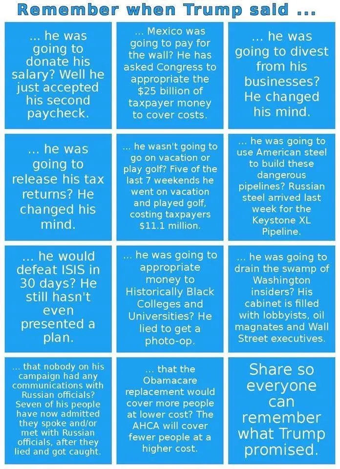 1. He told you he’d repeal Obamacare and replace it with something “beautiful.” You bought it. But he didn’t repeal and he didn’t replace. (Just as well: His plan would have knocked at least 22 million off health insurance, including many of you.)