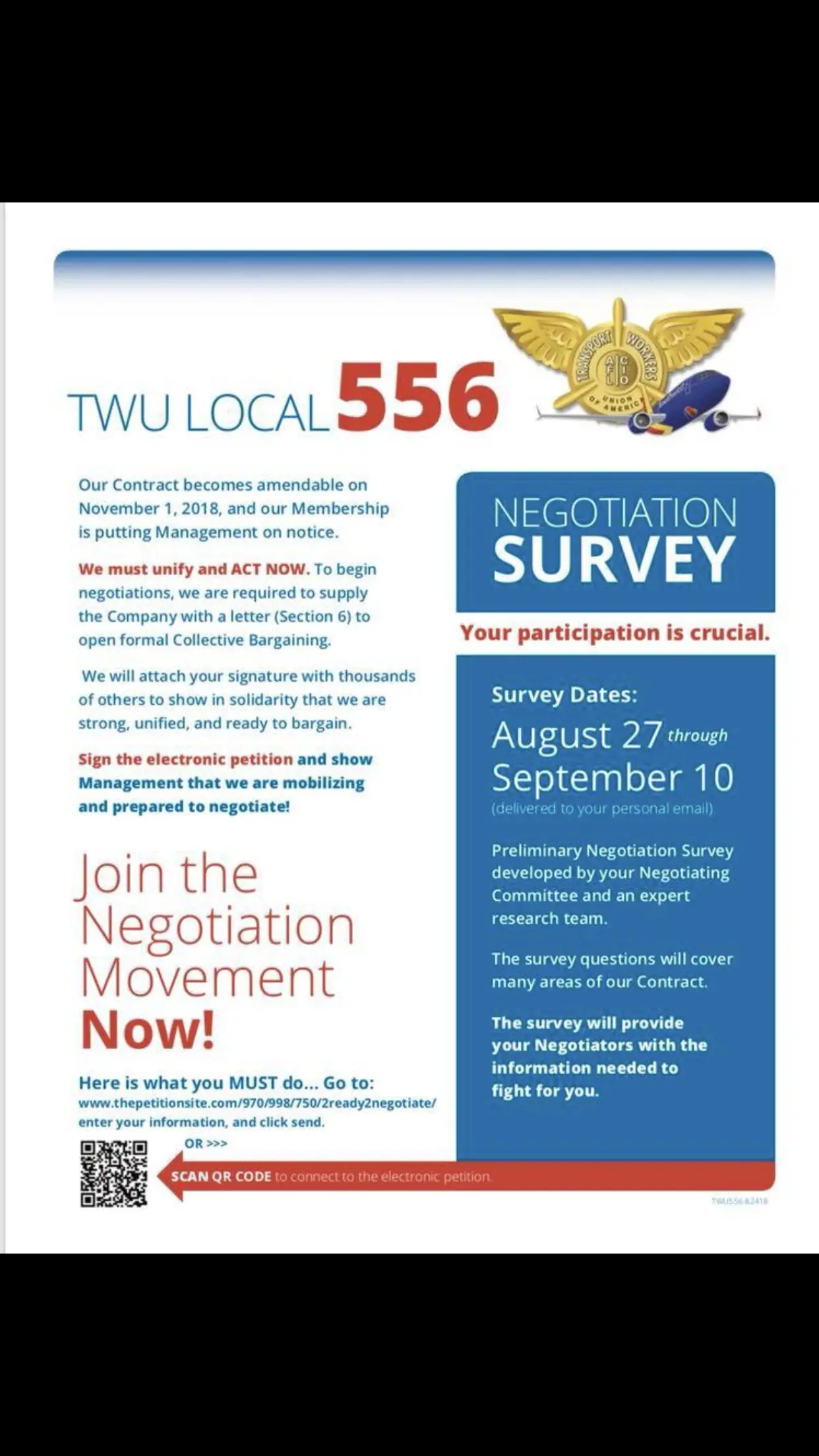 “Your TWU Local 556 Negotiating Committee is conducting a preliminary survey for upcoming Contract negotiations. Membership input is vital and will play an important role in bringing your voice to the bargaining table with your Negotiating Committee. This survey will take approximately 15 minutes to complete. All individual answers will be kept confidential and anonymous. Remember, every Member’s voice counts so please complete the entire survey.